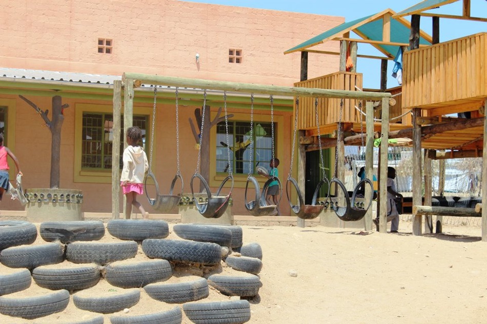 Mammadu Trust verfügt über ein ca. 10.000 qm großes eingezäuntes Gelände inmitten des Armenviertels Otjemuise im Nordwesten von Windhoek. Das L-förmige, massiv gebaute einstöckige Gebäude ist in warmen Farben gestrichen und wirkt optisch nicht anders als ein Kindergarten in Deutschland. Es umfasst die gesamte Infrastruktur, die zum Betrieb eines Tages-Kinderheimes erforderlich ist: • 2 voll ausgestattete Klassenräume (ca. 40 und 50 qm) mit ergonomisch fachgemäßen Schreibpulten. Wie wir das aus unseren Kindergärten und Grundschulen kennen, hängen Fotos der Kinder an der Wand, Landkarten von Namibia mit den Provinzen, von Europa, und viele Dinge, die die Kinder selbst gebastelt haben. • Ein Werkraum und Nähzimmer mit 3 Näh- und Stickarbeitsplätzen, ausgestattet mit modernen elektrischen Nähmaschinen. Im Nähzimmer treffen sich die Mütter der Kinder regelmäßig und fertigen Handarbeitsprodukte. Die Erlöse aus dem Verkauf dieser Produkte teilen sich die Mütter und Mammadu Trust. • Eine voll ausgestattete Großküche mit Vorratsraum und Tiefkühltruhe. Eine Besonderheit der Mammadu Trust-Küche sind 3 Sonnenöfen. Sie sind wie transportable Frühbeete (ca. 1 m breit, 50 cm hoch, 50 cm tief) mit einer Glasscheibe als Deckel und innen mit Alufolie ausgekleidet. Wenn sie genutzt werden sollen, werden sie ins Freie in die Sonne geschleppt. Die Köchin backt dann dort zusammen mit den Kindern Brot, sie garen Kartoffeln und Gemüse und haben immer viel Spaß dabei. • Ein keiner Lagerraum für Spielsachen und Hygieneartikel (Bälle, sonstiges Sportgerät, Zahnbürsten usw.). • Toiletten und Duschen für die Kinder (jeweils Jungen und Mädchen) mit Waschbecken, und separat für das Personal. • Eine große schattige Veranda entlang des gesamten Gebäudes. Dort können die Kinder essen, spielen, Schwätzchen halten oder einfach nur mal rumsitzen. • Vor dem Gebäude ist ein Spielplatz mit Rutschbahn und Klettergerüst. • Ein großer Sportplatz (aus Schotter) mit 2 wackligen Toren. • Ein kleines Gewächshaus zum Gemüseanbau (zum Lernen für die Kinder). Die Wände sind aus Plastikflaschen, die eine entsprechende Erwärmung des Innenraums bewirken. • Ein kleiner Gemüsegarten. Der gesamte Gebäudekomplex und das Freigelände sind blitzblank sauber. Alles wirkt sehr einladend und professionell.